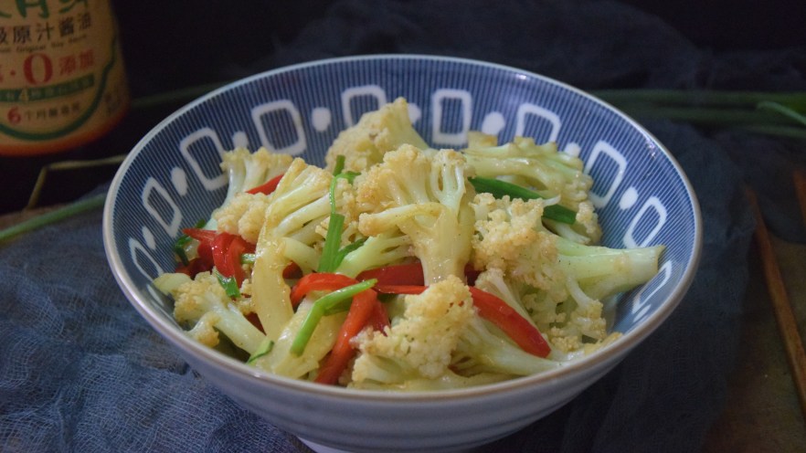 6. 热锅凉油,倒入花菜翻炒两分钟左右