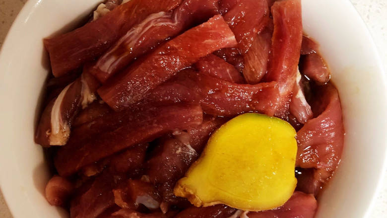 1. 先将里脊肉切条,2*10cm,然后加入适量盐,料酒,生抽和生姜腌制