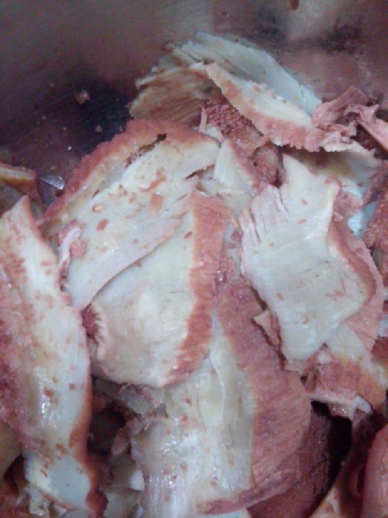 - 然后一片一片堆起来,生菜放在最上面,水果主要是来均衡牛肚的香辣味。为大众必备的。