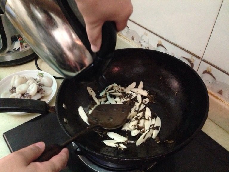 7. 最后倒入小墨鱼盖上锅盖煮5分钟