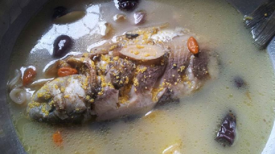4. 倒入开水,没过鲫鱼,大火煮15分钟