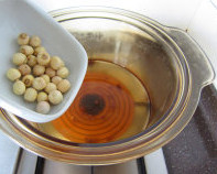 5. 莲子泡发后,小火煮至软烂,沥干水分备用