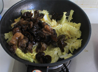 9. 一起放入娃娃菜的菜叶和木耳,快速煸炒至成熟
