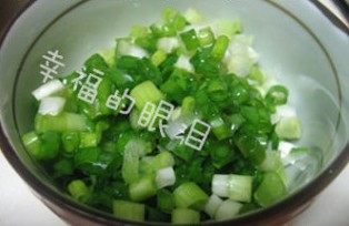 2. 将香葱碎放入猪肉糜中,放入适量的料酒、香油搅拌均匀,腌制片刻