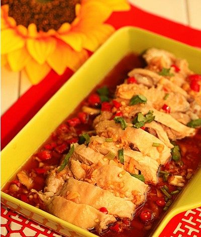 4. 把鸡斩件装盘。鸡头鸡爪子放一边