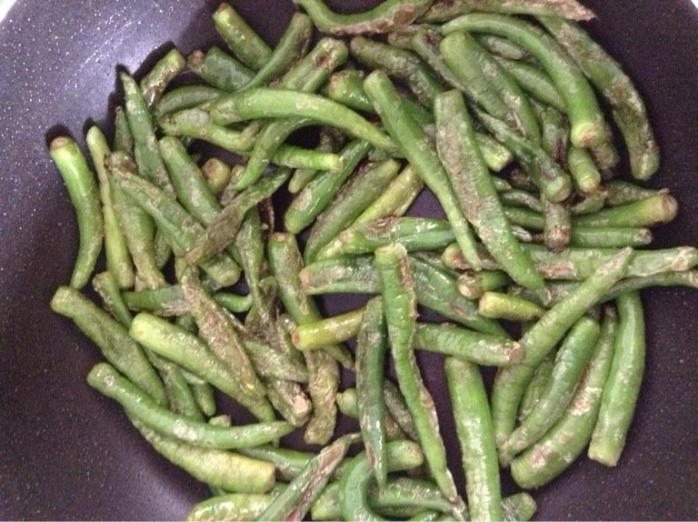 2. 锅里放一小勺植物油,油热后放入辣椒放少许盐慢速翻炒,要炝出虎皮来所以不能翻炒过于太快。整个都成虎皮了就可以起锅了,
