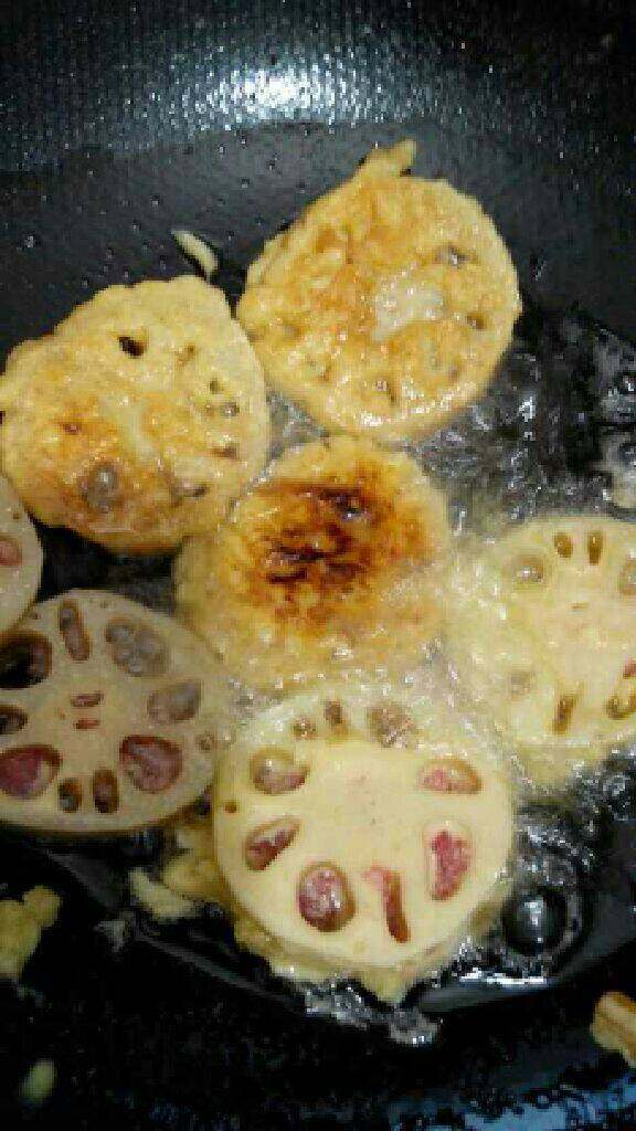 12. 锅里放入油,开始炸藕合,油有些小泡了