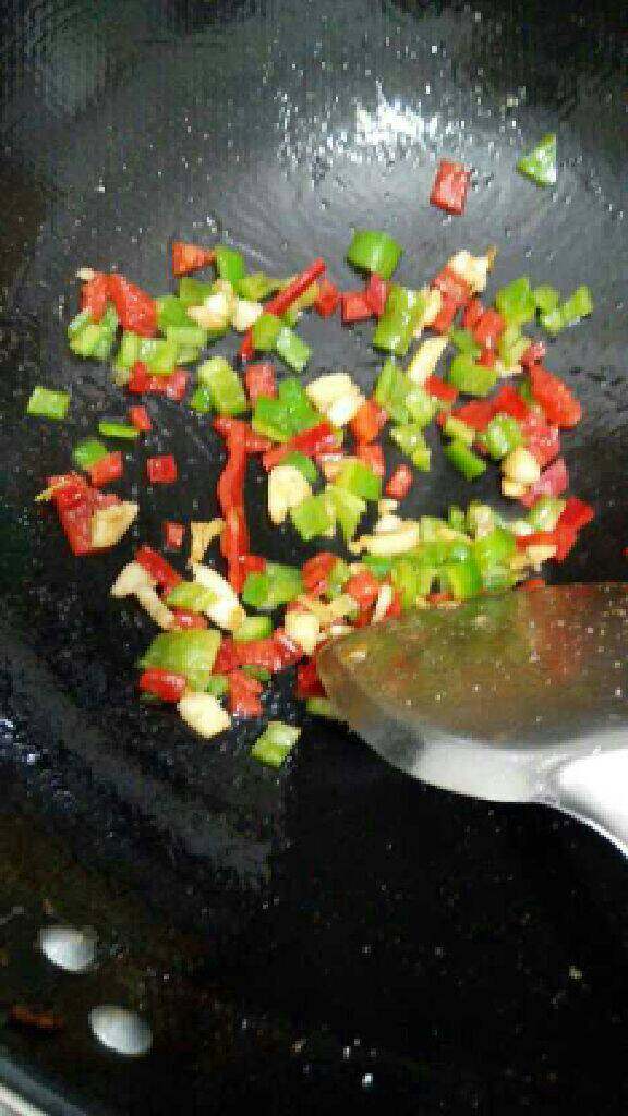 21. 倒入青红椒,加一点盐翻炒一下,一共加了3次一点点盐,这样加起来就够了