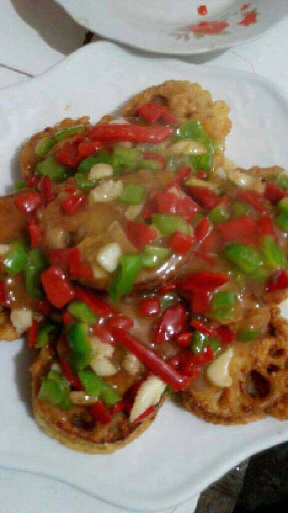 4. 一根藕全部切好,辣椒切成小丁,这次藕买的不好,笨老公买的,还好做这个不挑