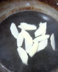 8. 另起锅放油,爆香葱姜;辣椒,倒入冬笋片;肉片炒匀