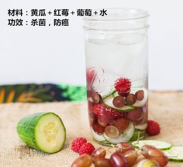 7. 材料:黄瓜+红莓+葡萄+水。功效:杀菌、防癌。