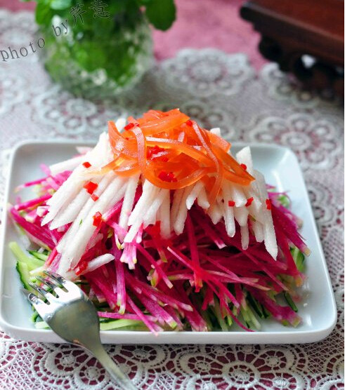 2. 黄瓜切细丝,铺在盘子底部,萝卜切细笋
