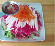 5. 在黄瓜丝上放入萝卜丝、梨丝和山楂糕丝
