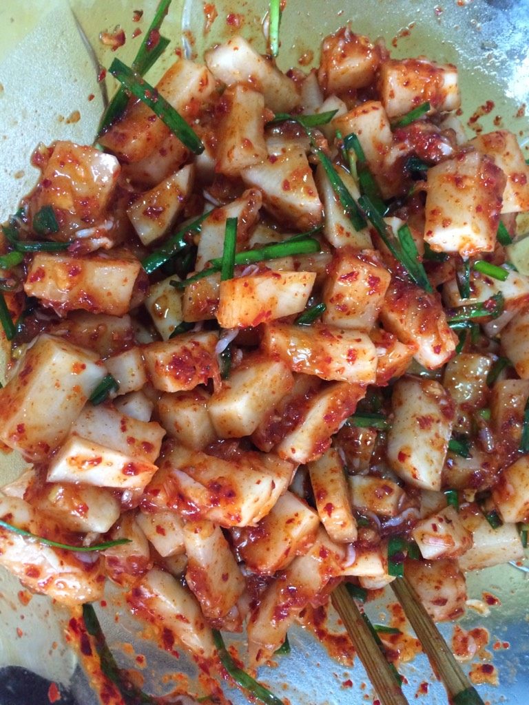 6. 如图剩下的酱料把白萝卜切成颗粒研制上也很好吃
