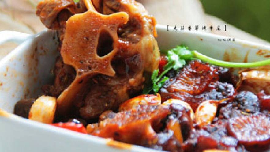4. 将腌制好的牛尾巴放入烤碗中,并在缝隙里塞上对半切开的小番茄和掰开的蒜粒;在牛尾巴表面刷上一层剩下的调味汁,蒜上也可以刷一些;送入已经预热好的烤箱,中层,上下火,190度~200度,烘烤10分钟左右;将烤碗取出,在牛尾表面加刷一层调味汁;再送入烤箱,继续烤10分钟,至牛尾表面微微发干。有焦香味道即可。取出后,放上洗净的香草开吃