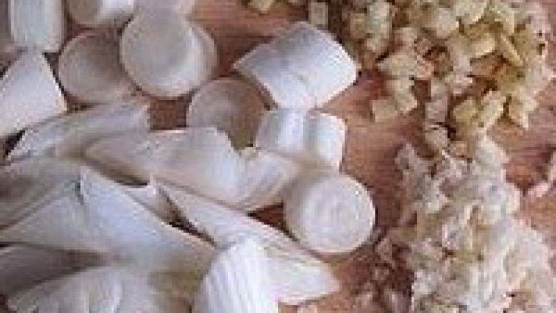3. 热锅后放油,加入姜蒜小火煸炒出香味;加入大葱煸炒到被油浸润;