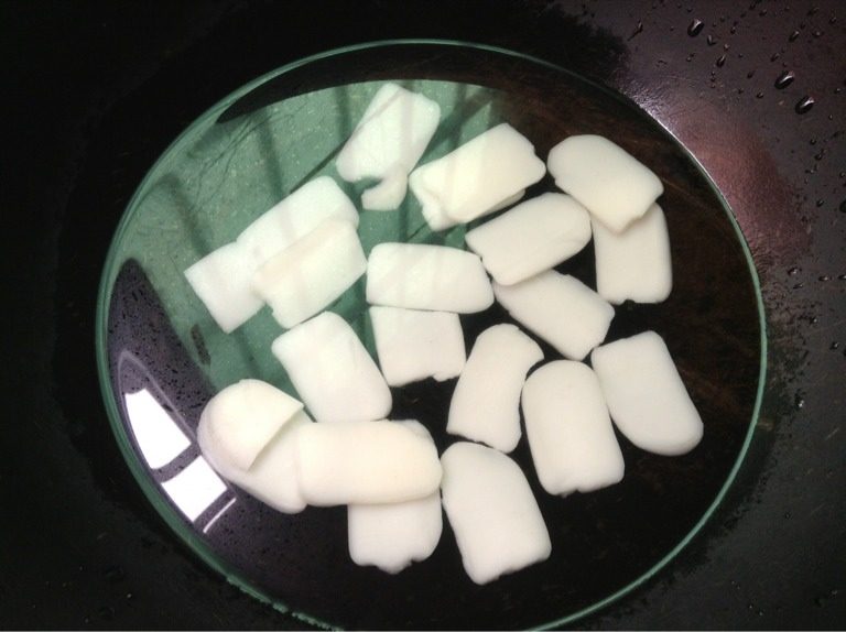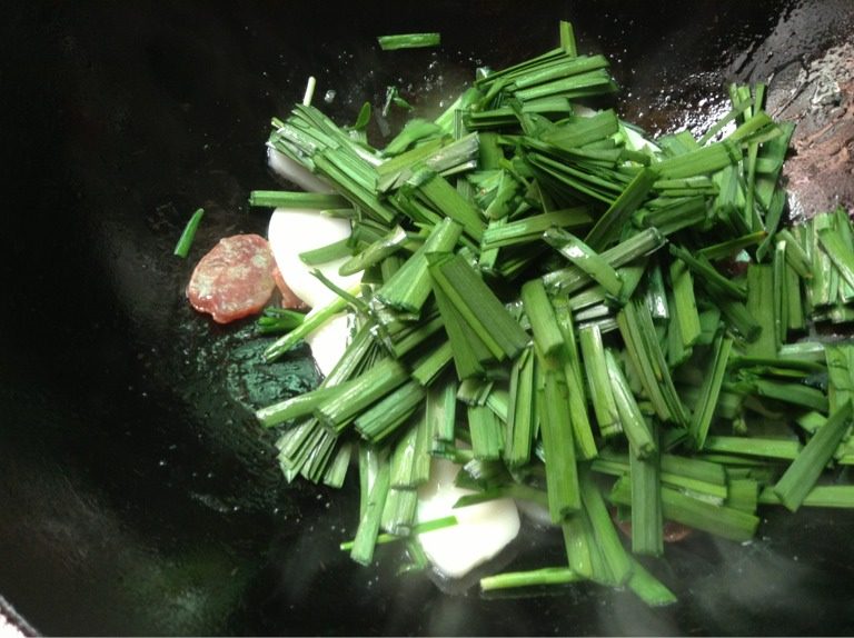 4. 如图再放入韭菜茎部和年糕翻炒,放点开水呛一下锅