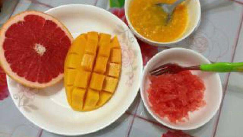 7. 加入芒果泥,再加入芒果肉和红西柚肉。弄两个车厘子装饰一下即可。(这些材料可以先全部放入冰箱冷冻后再吃更爽口)。