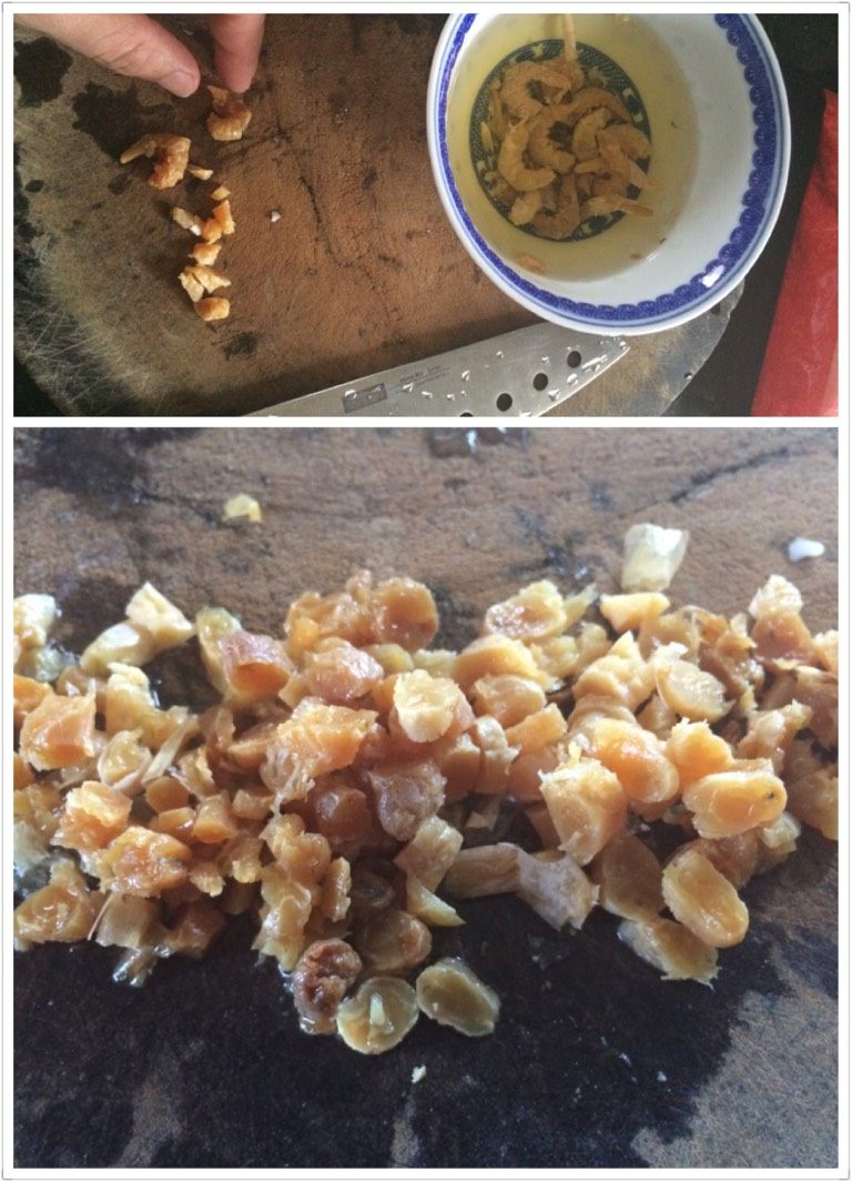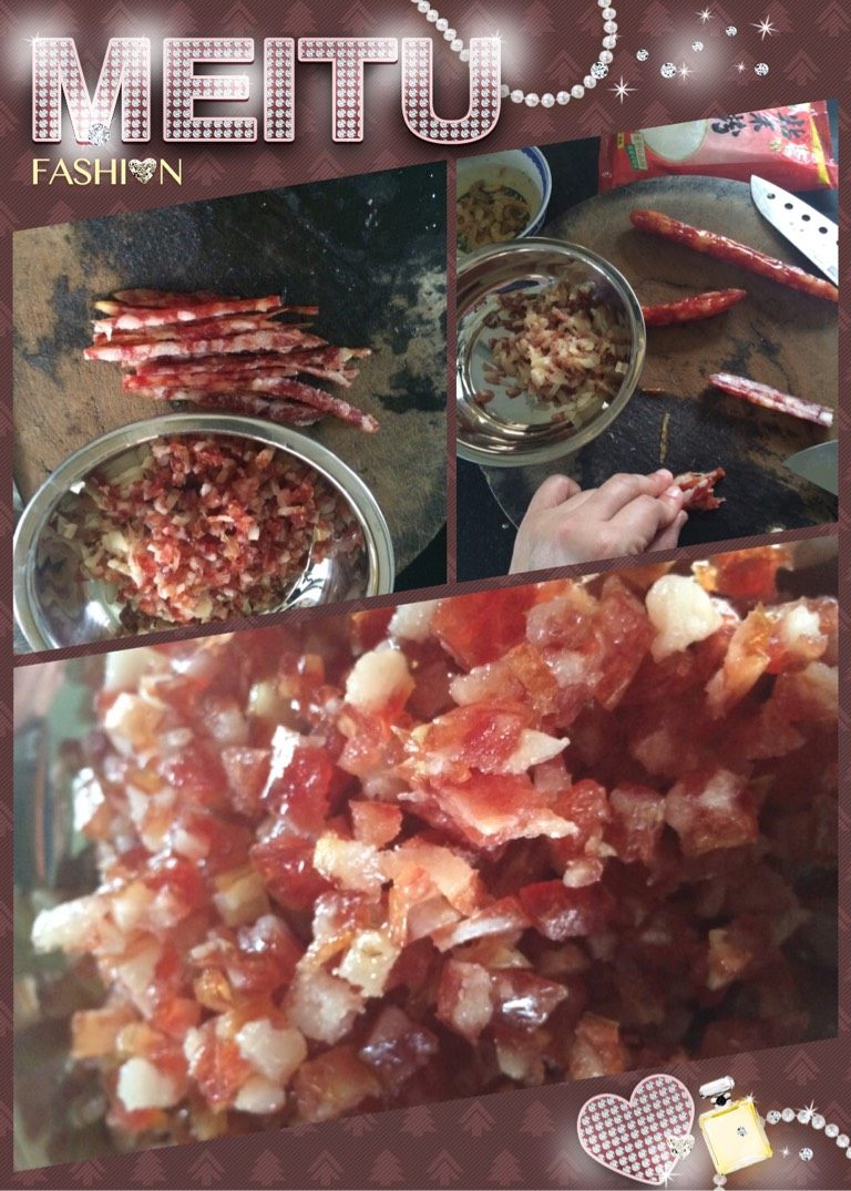 2. 虾米用水泡软后切粒、江瑶柱用水泡软后捏碎加入到腊肉粒中待用