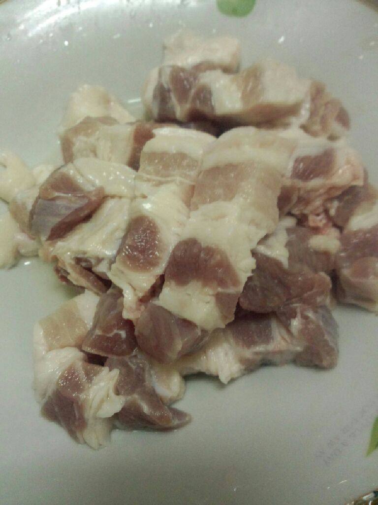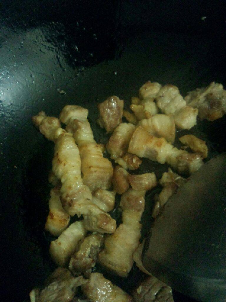 5. 锅在次烧热把五花肉放入炒 炒至出油略金黄