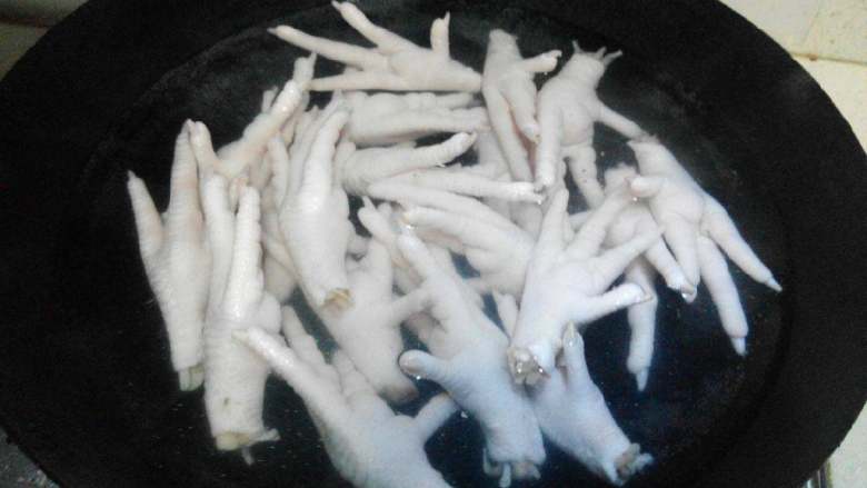 1. 起锅,坐水,放入洗净的鸡爪飞水