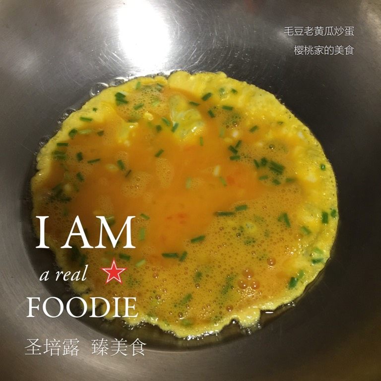 毛豆老黄瓜炒蛋,如图起油锅,至六分热倒入蛋液,略微凝固后翻炒,至全部凝固即盛起备用;