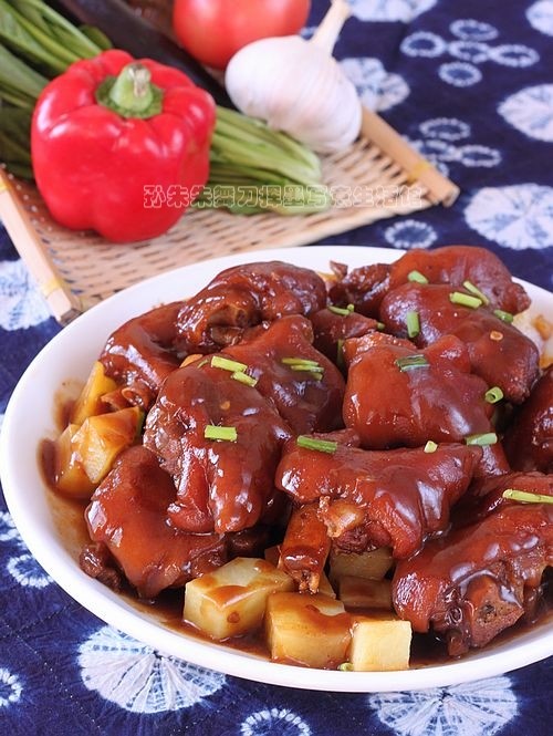 用料:猪手2个、大土豆1个、大葱2段、生姜4片、调料包1个、糖色1碗、生抽20克、老抽15克、料酒少许、豆瓣辣酱30克、水淀粉少许做法:将猪手用清水浸泡2